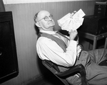 A. W. Bradshaw, looking at poll tax receipts. He is sitting down, and leaning back on the chair.