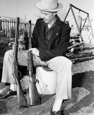 "The Gun That Won the West" (left) is shown here for comparison with the newest " Model 70 Featherweight". This lightest of all Winchesters weighs just 6 and a half pounds while other modern rifles range from eight to 12 pounds. Wayne Brown, WBAP-TV cameraman, holds the guns. The old "Winchester 73" is a short-barrel carbine giving much evidence of saddle wear.