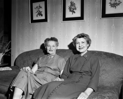 Mrs. W. H. Hendrick of Mathis, left, and Mrs. Dean Hunter of Columbus, Ohio, are the house guests of Mrs. Jack Tarpley. Mrs. Hunter is a former resident of Fort Worth. They are shown seated on a couch.