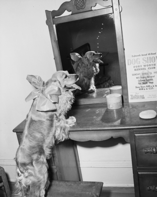 "Sugar", a blond cocker spaniel, owned by Jack Patterson of Arlington Texas, is shown in front of a mirror after being groomed in preparation for the Fort Worth Kennel Club's eighteenth annual all-breeds dog show at the Will Rogers Memorial grounds. Published in the morning edition, April 13, 1950.