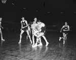 TCU's Ross Hoyt looks as though he might be bucking the line with the basket ball but he's only trying to get possession from Texas Aggie Joe Hardgrove (#88) at right. Behind Hoyt and Hardgrove is Frogs' Henry Ohlen while Cadets' James Addison (#78) watches. The game played at Will Rogers Coliseum, Frogs won, 67-36.