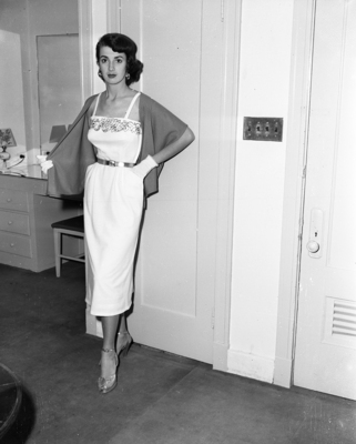 For after-five wear, Miss Wool, Janet Lee, has this white wool jersey dress with gold beads, gold belt and contrasting stole.