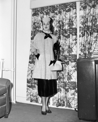 Matched from head to bag, Janet Lee models a Betty Jean coat and Frank Benson hat and bag all of mohair and black velvet.
