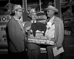 Three Lions Clubs journeyed to East Texas Tuesday in the first goodwill tour in behalf of the Southwestern Exposition and Fat Stock Show. Trip chairmen were, left to right, Joe Dines of the Morningside Lions Club; Ralph Stowell of the Riverside club and L. C. Hartwig of the South Side Club. They are holding an advertisement for the Stock Show to be held from Jan. 30 - Feb. 8, 1953.