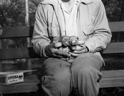 At the Forest Park Zoo, an unidentified man holds puppies born to Dora, Dingo (wild Australian dog) at the zoo. Ho, Hum. Drowsy dingo puppies.
