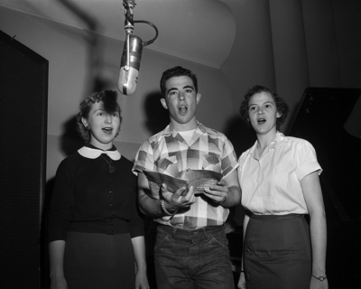 Three Amon Carter Riverside High School students record songs as part of a Junior Red Cross project to spread knowledge of America overseas. Left to right are Peggy Abel, Red Cross secretary; Devon Hamilton, soloist, and Patsy Ross, reporter.