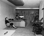 The new penthouse reception room of Service Life Insurance Company in the remodeled Insurance Building. In the room, left to right, are Betty Martin and Miss Delle Howard secretaries. The room has modern furnishings, live plants and drapes.