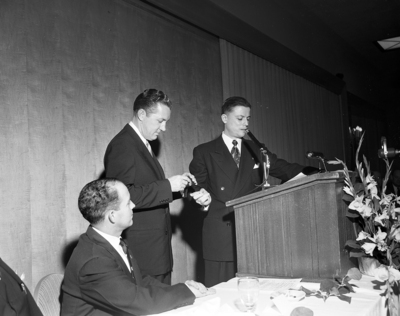 John S. Justin Jr., left, Fort Worth's Outstanding Young man of 1952, is presented a diamond studded lapel pin by Tom Law at the Junior Chamber of Commerce's annual banquet honoring the judge's choice for the year.