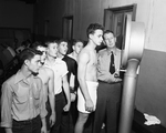 Five schoolboy lightweight rivals look on as Don O'Haire (extreme right), a Golden Gloves official, checks the weight of Diamond Hill's Robert Fawks. Watching are (left to right) Dick Richard of Poly, Gene Barnett of Handley, Orville Means of Diamond Hill, Skeet Brown of Amon Carter Riverside and Dean Wright of Diamond Hill. Fawks made the 137-pound limit.