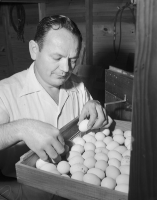 E. A. Hosch of 3016 Aster, is shown standing arranging with a tray of eggs in an incubator that would soon hatch Texas' first flock of native born wingless chickens. The eggs normally sold for $100 per dozen. Published in the evening addition, April 14, 1950.