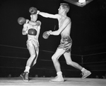 Richard Keathley, left misses left then evades right thrown by Sidney Pettigrew in novice welterweight bout at regional Golden Gloves opening Thursday night, January 15. Pettigrew won on decision.