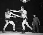 William Roper, left, tries to ward off James Mitchell in open middleweight battle at first night of regional Golden Gloves Thursday, January 15 at Will Rogers Coliseum. Mitchell won decision. There is a referee observing the match.