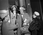 Mrs. Harry Womack and Reverend William Frazier, part of the Fort Worth group that departed abroad a special car Friday afternoon for presidential inauguration activities in Washington, wait a moment in the car's vestibule to receive a sendoff from Mr. and Mrs. Del Barron, who will be going to the inaugural ball at Colonial Country Club here while the ball in Washington is in progress. Barron is a Republican precinct chairman. Mrs. Womack is organizer of the term "woman-power for Eisenhower".