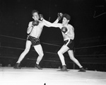 Veteran Andy Eagleton slams right to Thurman Van Sickle's jaw in open heavyweight bout at regional Golden Gloves tournament Friday night January 16. It was wasted effort, though, as the younger Van Sickle rallied to win decision and gain finals. Textbox on the photo on news clipping reads, "Gloves facts, figures What - Third program of 17th annual Fort Worth Regional Golden Gloves amateur boxing tournament. Where - Will Rogers Memorial Coliseum. When - Saturday 7 p. m.; gates open 6 p. m. Program - Forty-four bouts in high school, novice, and open classes. Tickets - On sale until 5 p. m. at Central Ticket Office, Hotel Texas lobby; after 6 p. m. at Coliseum. Prices: 60 cents, $1, $1.50, $2.25. Proceeds - Go to Star-Telegram's Free Milk and Ice Fund and Goodfellows."