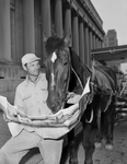 Ex-marine Richard Thompson, and his 8-year-old horse "Comet", seen consulting a map, arrived in Fort Worth during their trip from Maine to California, in which the two had already traveled 2,700 miles through 16 states. The ex-marine rescued Comet from the meat block and considered the horse to be "a great guy". As a pastime, the 33 year-old Thompson said he would talk to Comet, as well as take copious notes on the two's adventures, that he hoped would one day go into book form, possibly titling it "The Loney Road". Published in the evening edition, April 14, 1950.