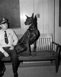 A hungry Great Dane waits impatiently for lunch with Saginaw Policeman C. C. Dawson. The 116-pound animal, stolen from Oregon, will remain in Dawson's custody until it can be returned.