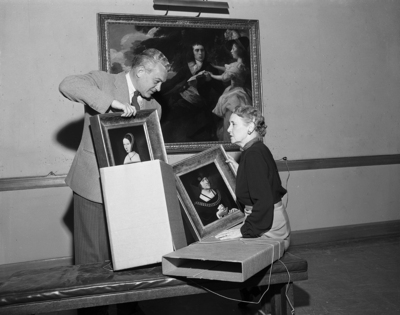 Director Dan Defenbacher of Fort Worth Art Association and Mrs. Tim Lawrence, head of the Public Library's art section, are shown here unpacking some of the 17th and 18th Century paintings from Knoedler's. They're getting a pre-look before the preview Monday at 8 p.m. in the Public Library gallery.
