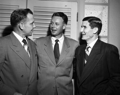 Image shows three contenders for Jaycee state president met to compare signs. Seeking top offices are, left to right, Harold Bennett, Colorado City, a state vice president, John G. Hurd, Laredo, head of the Laredo Jaycees, and William G. Mcdanel, Dallas, national Jaycee director. Published in the Fort Worth Star-Telegram morning edition, April 13, 1950.