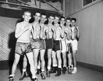 Winners of high-school class titles in Fort Worth regional Golden Gloves were, left to right, Flyweight Willie Ballard, Brewer; Bantamweight Tommy Vance, Poly; Featherweight Jack Brock, Poly; Lightweight Robert Smith, North Side; Welterweight Robert Purnell, Poly; Middleweight Millard Runnels, North Side; Light Heavyweight James Fawks, Diamond Hill; Heavyweight Gale Ortiz, Diamond Hill. They are lines up in boxing pose.