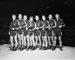 Here are the eight open class champions who'll represent Fort Worth in the State Golden Gloves Tournament February 11-15 at Will Rogers Memorial Coliseum. Left to right are Flyweight DeWayne Neeley, Bantam Scott Sherman, Feather Buddy Reeves, Lightweight Mike Ward, Welter Billy Tucker, Middleweight Bobby Agee, Light-Heavy Dub Graves and Heavyweight Donnie Fleeman. They are all standing in the boxing ring, and are holding trophies.