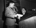11-year old Larry Kardaras is shown with $1,000 bond that he won in a national safety contest. He is receiving it from Mrs. Laurence Mansfield, Vice President of the Fort Worth Safety Council, at a luncheon in Hotel Texas.