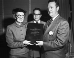 Mrs. O. L. Albritton, left, president of the Corsicana League of Women Voters, and Frank Dickson, right, vice president of the Corsicana Chamber of Commerce, accepted a plaque on behalf of Navarro County for having the highest percentage of voters in the November 4 election of any county in Texas. Presenting the award in behalf of the Childress Jaycees was John Forbes, center, of Childress.