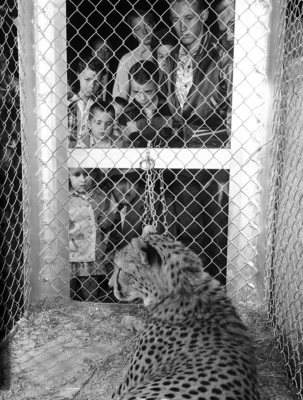 Image shows curious crowds look at the African cheetah in its cage at the Fort Worth Zoological Society booth in the Texas and Outdoor Show. Published in Fort Worth Star-Telegram evening edition April 13, 1950.