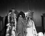 Lord High Chancellor Parker Wilson, center, placed the crown on Patti Cameron of Texas State College for Women as she was declared queen of the Mardi Gras at Will Rogers Memorial Coliseum Wednesday night. Ronald Clinkscale of Texas Christian University, left, was king of the celebration. Crown Bearer Dwight Lee Klingenberg of Saint Mary's School, and Flower Girl Connie McConnell of Our Lady of Victory, watching the crowning.