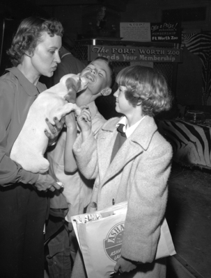 "Tarzan", the awkward pointer pup that tries so hard and usually does everything wrong in the Frank Weed bird dog act at the Texas Sports and Outdoor Show, kisses the chin of a young admirer to show his gratitude for attention. Mrs. Weed holds "Tarzan" as Robert W. Powell, 12, of 2506 Vaughn Blvd., dodges from the canine caress, and Iris Ruth Cloud, 12, of 3425 N. Littlejohn, is amused. Published in Fort Worth Star-Telegram morning edition April 13, 1950.