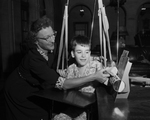 Mrs. A. R. Smith of 109 Johns Terrace credits the March of Dimes with giving her son, Johnny Roherty, 10, "everything he needs" in polio care. Here they are shown making their contributions to the drive.