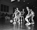 Paschal's John Claunch (#15) appears to have three arms as he fights for a loose ball in Thursday night's game with North Side in Handley's gym. But one of the limbs belongs to North Side Jimmy Shofner (No. 9, behind Claunch). That's Ray Boots (#6) of Paschal at right. The Panthers won, 66-33.