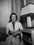 Mrs. Glen Thompson of Kansas City was here for the wedding of her brother, Wayne Boswell Waynock, and Mrs. Kent Graves which took place at the home of the bride, 111 North River Crest Drive. Mrs. Thompson also visited her mother, Mrs. Helen B. Waynock, 505 Monticello Drive. She is shown seated in a room and smiling happily.