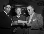 Mrs. James Leonard, secretary of the Tarrant County Chapter, National Foundation for Infantile Paralysis, accepts a $250 check from the National Fashion Exhibitors of America with C. T. Sheats, left, exhibitors' manager, and Allan S. Klein, president, representing the fashion organization.