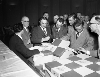 Dinner Honoring Horned Frogs. Left to right, Dan D. Rogers, Howard Grubbs, withgroup of Horned Frogs.