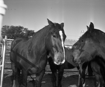 On left, Old Whistler, bucking horse that has been ridden only once, is one of the tougher and meaner pieces of horseflesh that will be on exhibition here at the Southwestern Exposition and Fat Stock Show Rodeo opening Friday night at Will Rogers Memorial Coliseum.