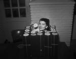 Gladys Crowder, a secretary at the Chamber of Commerce surrounded by welcome tags to the Southwestern Exposition and Fat Stock Show. The tags were distributed to merchants for the first time Monday and will be given out as long as they last at Charles G. Cotten's office at the chamber, 114 E 8th.