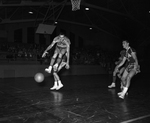 High jumps? No, just Rams' Sam Rasco jackknifing during leap for basket in attempt to regain ball that slipped away out of bounds. Action occurred in loss to Stephen F. Austin at Recreation Building. Rams won 78-72.