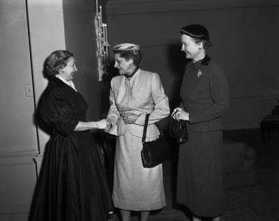 Mrs. Carl J. Aldenhoven, left, greeted Mrs. C. U. Daniel of Calgary, Ontario, a former Fort Worth resident, center, as Mrs. O. P. Newberry, right, waits her turn.