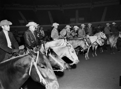 Elimination of cutting horses got under way Wednesday morning at the Southwestern Exposition and Fat Stock Show. Shown here are part of the almost 100 riders awaiting their turn. The entry list was to be culled to 24 horses to compete during rodeo performances.