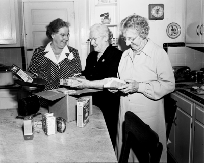 Packing the monthly sent to Scotland by the Daughters of Caledonia at the home of Mrs. Arthur Strathdee, 1721 Fairmount are left to right, Miss Maggie Strathdee, Mrs. Mary Taylor, a charter member of the 51-year-old club, and Miss Mary Anderson, president.