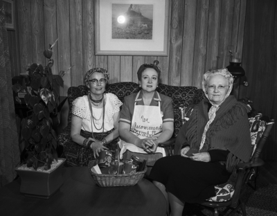Three of the Cadmean Club members, dressed to represent their hobbies, were photographed when Mrs. John C. Stewart entertained the club at her home on Oak Grove Road. Left to right are Mrs. P. K. Wathen, whose hobby is astrology; Mrs. C. W. Armstrong, whose hobby is cooking and Mrs. S. G. Ward, whose hobby is being a grandmother.