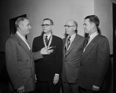 Clyde Penry, left, Longhorn Council vice president, congratulated Edgar Bowden of Weatherford and O. P. Leonard and J. B. Houston of Fort Worth, who received Silver Beaver awards Thursday night for outstanding work during 1952. The three were honored during the 33rd Longhorn Council dinner.
