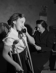 Judy Harris, 14-year-old person with polio, helps take reports on the Mothers March at March of Dimes headquarters as her mother, Mrs. Walter Harris of 2562 Shirley, march chairman, answers another call.