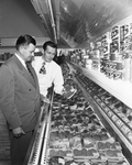 Garnett Parker of Wichita Falls, (left), opened the first Parker's Food Store in Fort Worth at Henderson and Pennsylvania. Mr. Parker is shown at his new store standing by the meat counter with his store manager, Carl Morton, (right). Published in the evening edition, April 13, 1950.