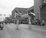 The Stock Show parade swings along Main Street Friday afternoon led by two riders on matched white horses, the riders carrying the Stars and Stripes and the Flag of Texas.