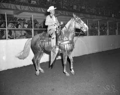 Sky Rambler, owned and ridden by Clyde K. Carter of Fort Worth, won first place in the palomino silver mounted open class man rider event at the horse show at the Southwestern Exposition and Fat Stock Show Friday night.