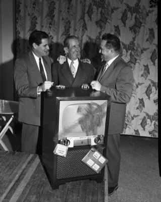 E. S. Kipps, center, receives a television set from employees of Southwestern Bell Telephone Company as a tribute for his 46 years of service. Presenting the gift are Johnny Rotan, left, plant assigner, and Robert Woodall, chief assigner.