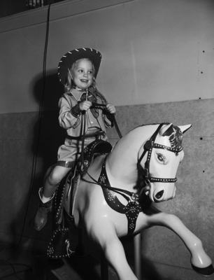Five-year-old Dale Belew takes no chances. She does her riding aboard a pony safely anchored in the Will Rogers Memorial Coliseum tower lobby during the Southwestern Exposition and Fat Stock Show Saturday. Dale is the daughter of Mr. and Mrs. David O. Belew of 6436 Rosemont.