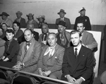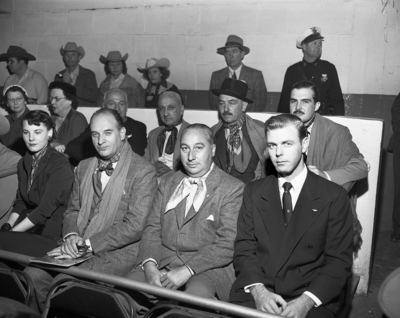 Six members of a mission from Argentina visited the Southwestern Exposition and Fat Stock Show Sunday. In front row, left to right, the visitors are J. Elordy and A. R. Larreta. In second row, left to right, are C. Ahumada, C. Arruabarrena, C. Carril and P. Ferro. At extreme right in front row is Gene Alexander, Fort Worth district sales manager for Braniff Airways Included who accompanied the group to the show.