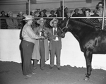 Poco Bueno, Quarter horse stallion owned by E. P. Waggoner of Fort Worth and Vernon, was named the grand champion Quarter horse stallion of the Southwestern Exposition and Fat Stock Show horse show Saturday morning. He is shown with, left to right, Bob Harper of Plainview, president of the American Quarter Horse Association; Waggoner, and George Tyler of Gainesville, who handled the horse Saturday morning.